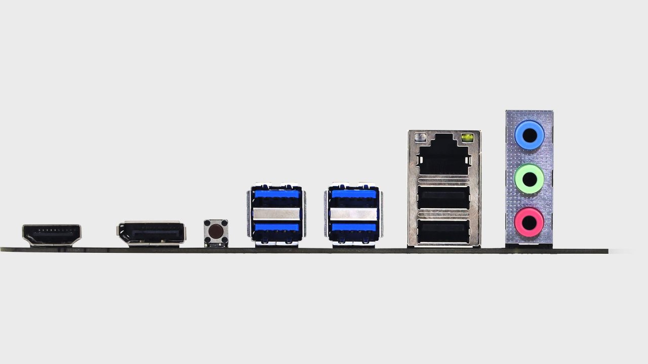 На задней панели размещены четыре порта USB 3.2 Gen1 Type-A, два USB 2.0 Type-A, HDMI 2.1 и DisplayPort 1.2. Сетевой контроллер реализован на базе чипа Realtek RTL8111H с поддержкой Gigabit Ethernet, а аудиоподсистема — на Realtek ALC897 с поддержкой 7.1-канального звука.